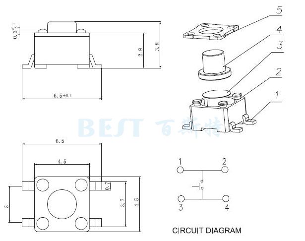 TS-1102A是貼片4.5×4.5輕觸開關,方形輕觸開關,有高度3.8/4.8/5.0/7.0四種高度,TS-1102A耐高溫,可以回流焊,